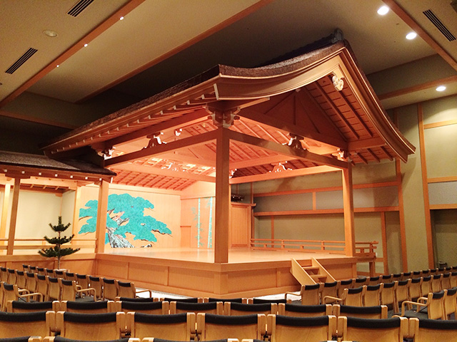 Οι ηθοποιοί - πάντοτε άνδρες, όπως στην ελληνική τραγωδία - εισέρχονται και εξέρχονται από εισόδους και εξόδους που υπάρχουν, αντίστοιχα, στην αριστερή και τη δεξιά πλευρά του ζωγραφισμένου πεύκου. Η αριστερή ως προς το θεατή πλευρά της σκηνής προεκτείνεται, λοξά προς το βάθος, με έναν μακρύ διάδρομο (χασίγκακάρι, hashigakari), στην άλλη άκρη του οποίου διακρίνεται η κουρτίνα ενός κρυμμένου δωματίου («καμαρινιού»), από όπου εμφανίζονται οι ηθοποιοί. Η εμφάνιση του ηθοποιού-πρωταγωνιστή (σιτέ, shite) είναι ιδιαίτερα επιβλητική και υποβλητική. Προχωρεί προς την τετράγωνη σκηνή με αργούς, μεγαλόπρεπους βηματισμούς και κινήσεις, προσπερνώντας τρία πεύκα που υψώνονται, σε ίσες αποστάσεις, κατά μήκος του λοξού διαδρόμου. Αυτά τον διευκολύνουν οπτικά στην πορεία του, λόγω των πολύ μικρών ανοιγμάτων που υπάρχουν στη θέση των ματιών του προσωπείου του.